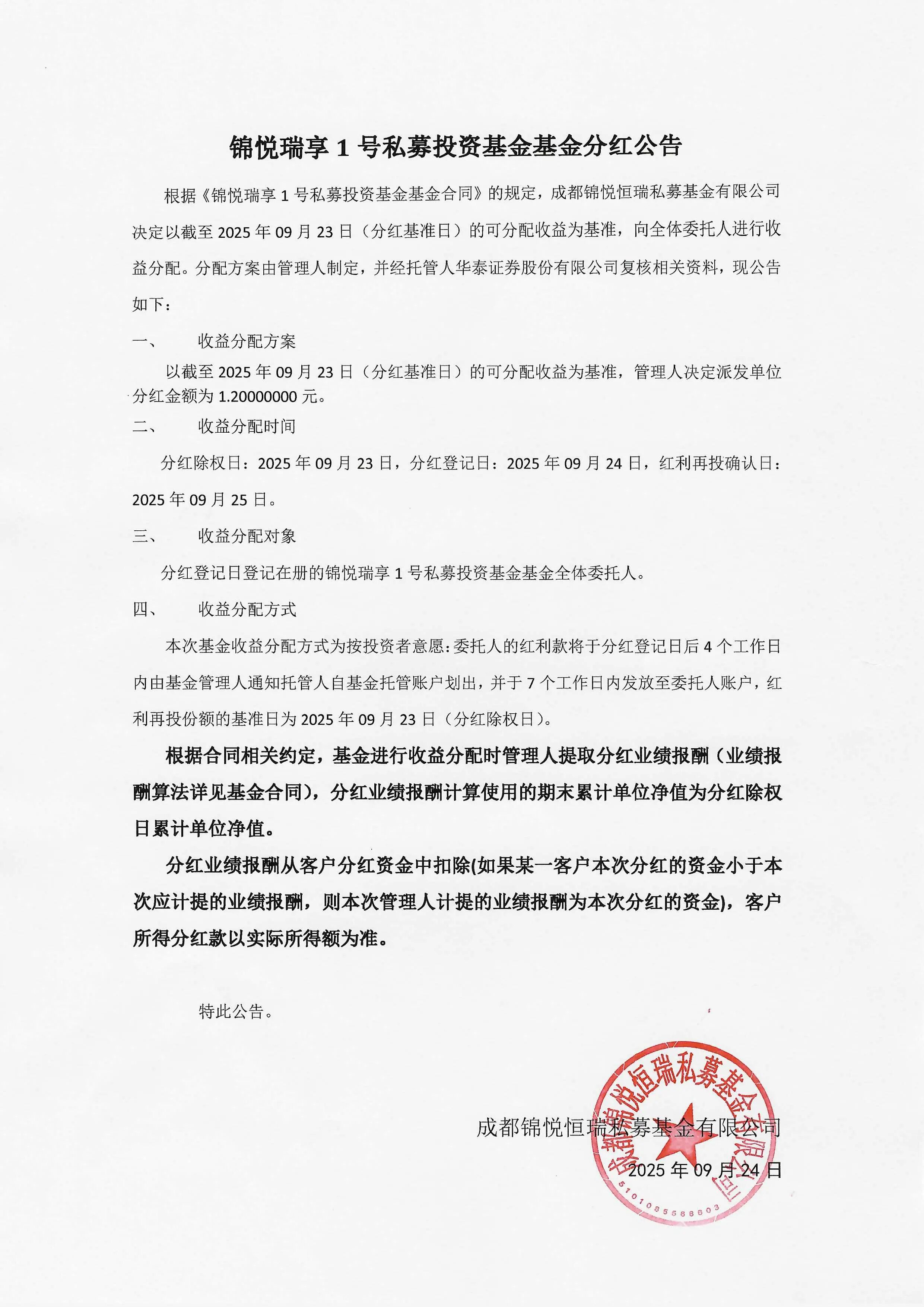 根据《锦悦瑞享1号私募投资基金基金合同》的规定,成都锦悦恒瑞私募基金有限公司决定以截至2025年09月23日(分红基准日)的可分配收益为基准,向全体委托人进行收益分配。分配方案由管理人制定,并经托管人华泰证券股份有限公司复核相关资料,现公告如下: