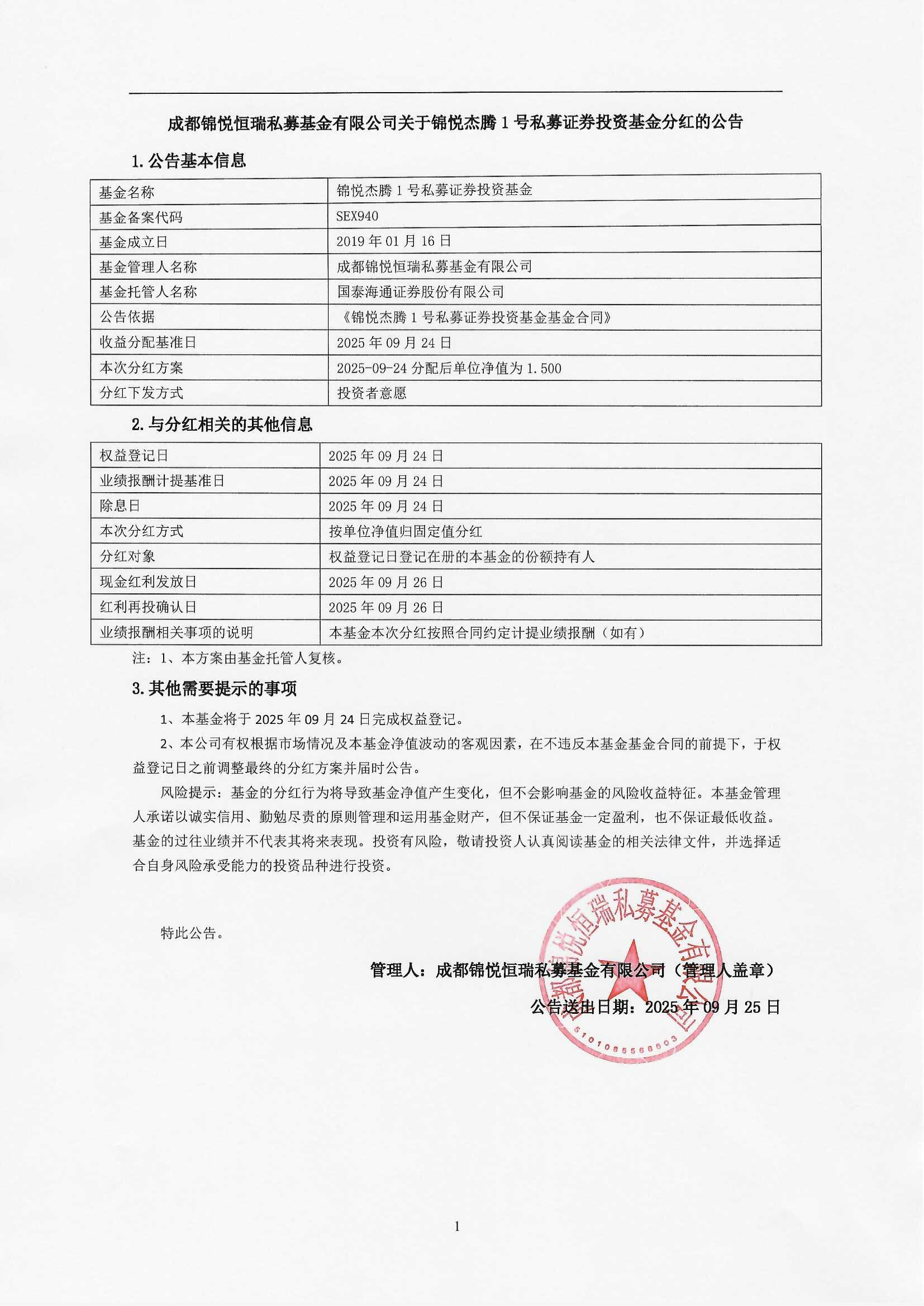 关于锦悦杰腾1号私募证券投资基金分红的公告