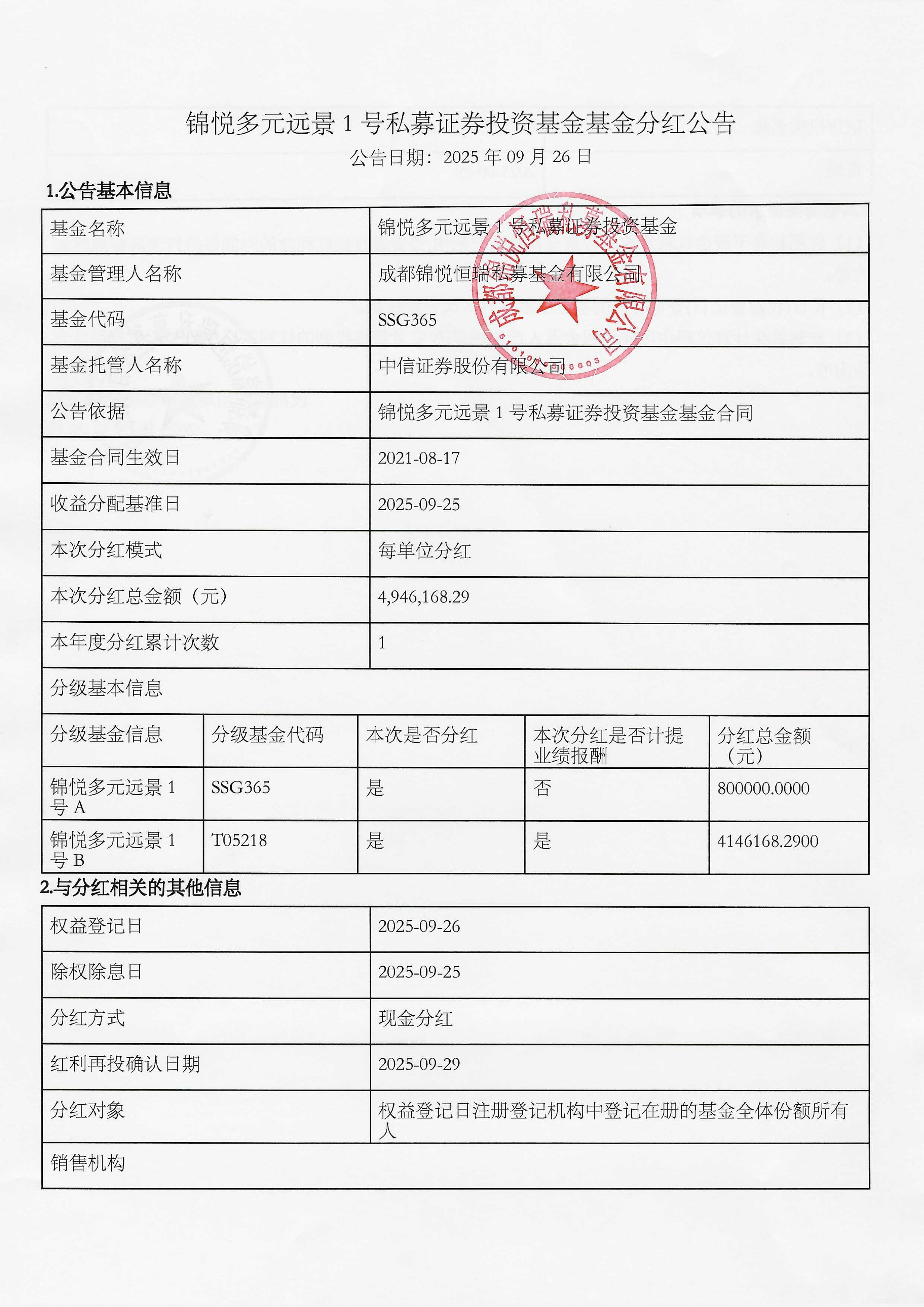 关于锦悦多元远景1号私募证券投资基金分红的公告