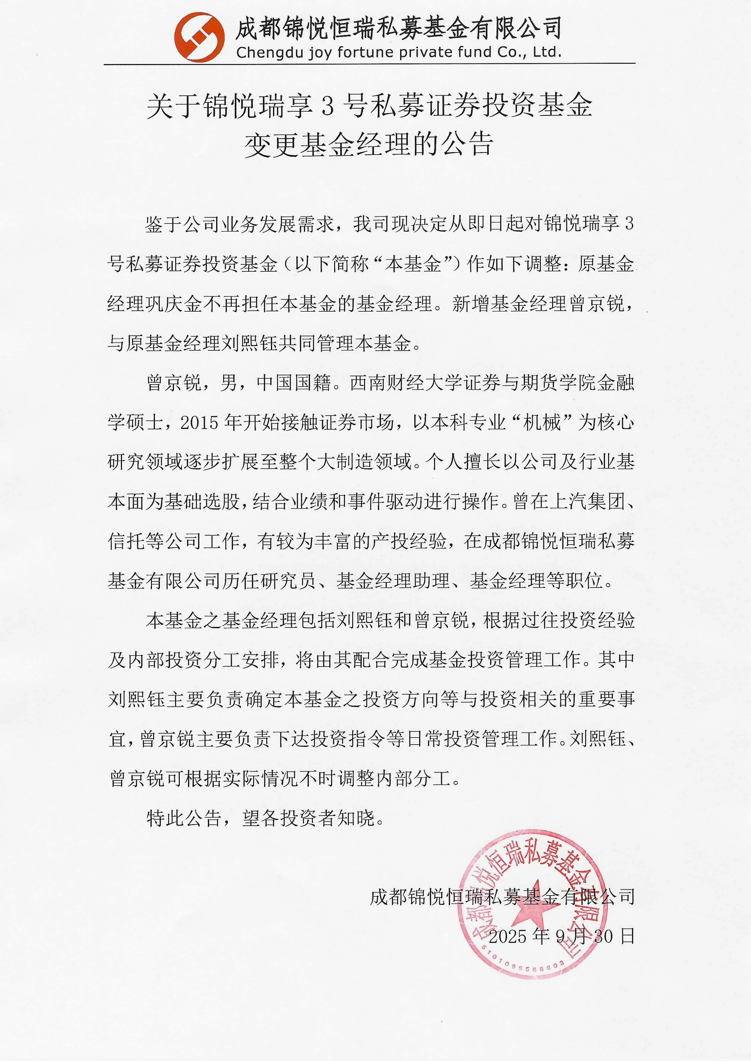 鉴于公司业务发展需求,我司现决定从即日起对锦悦瑞享3号私募证券投资基金(以下简称“本基金”)作如下调整:原基金经理巩庆金不再担任本基金的基金经理。新增基金经理曾京锐,与原基金经理刘熙钰共同管理本基金。