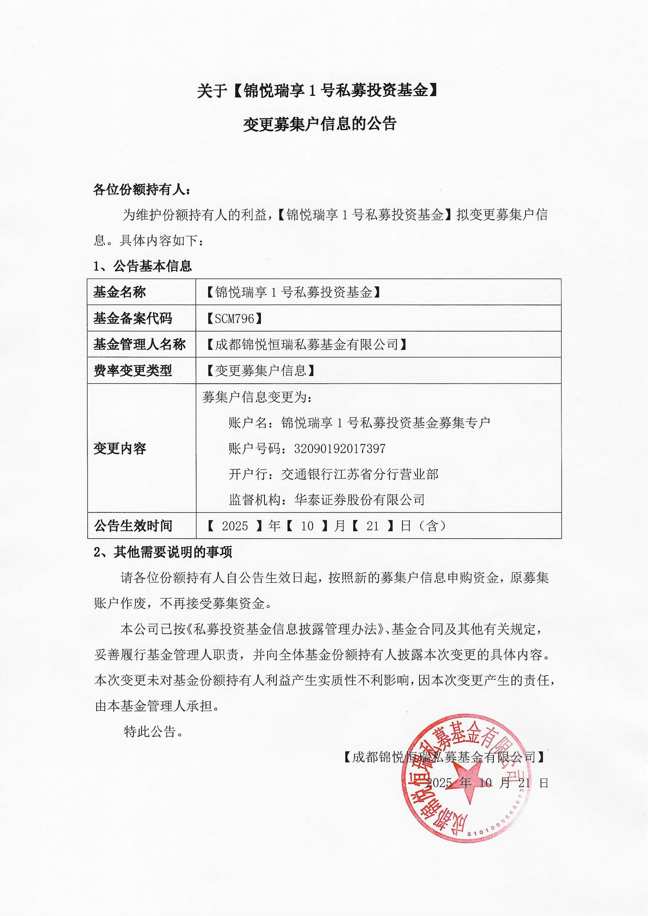为维护份额持有人的利益,【锦悦瑞享1号私募投资基金】拟变更募集户信息。具体内容如下: