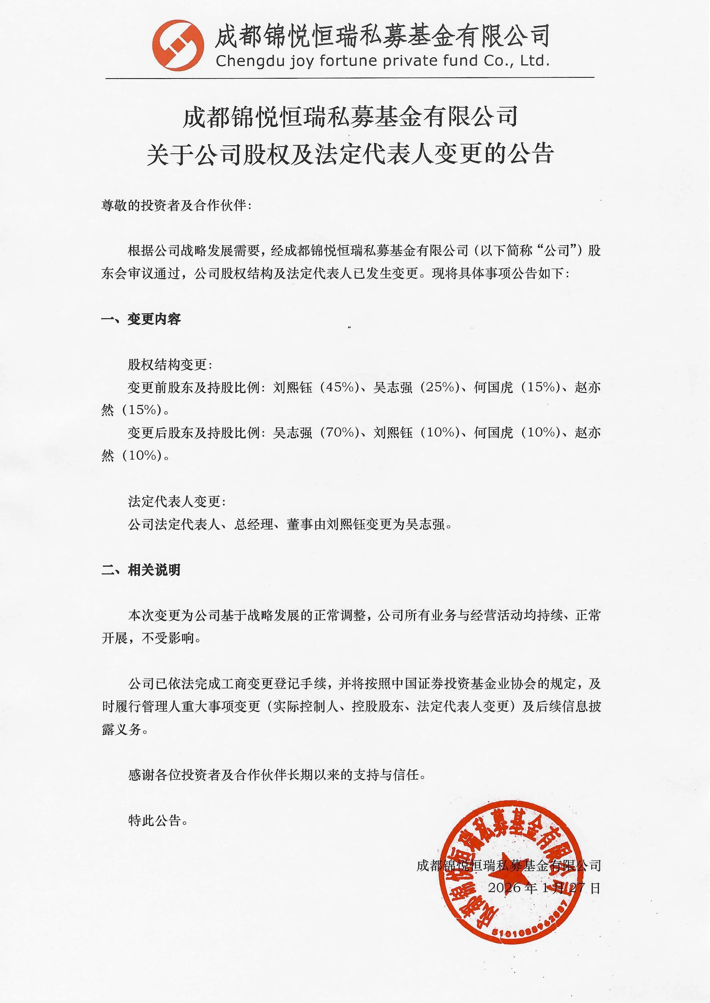 根据公司战略发展需要,经成都锦悦恒瑞私募基金有限公司(以下简称“公司”)股东会审议通过,公司股权结构及法定代表人已发生变更。现将具体事项公告如下: